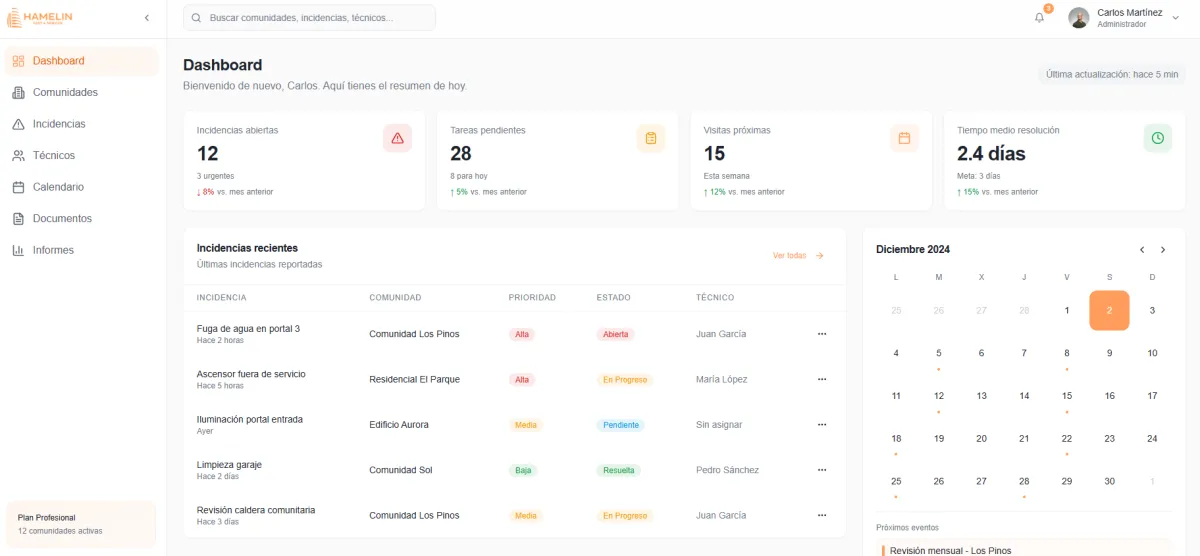 La plataforma centraliza la planificación de tareas, el control de incidencias, la asignación de técnicos y la gestión de comunidades, permitiendo digitalizar procesos internos y mejorar la eficiencia operativa de la empresa.