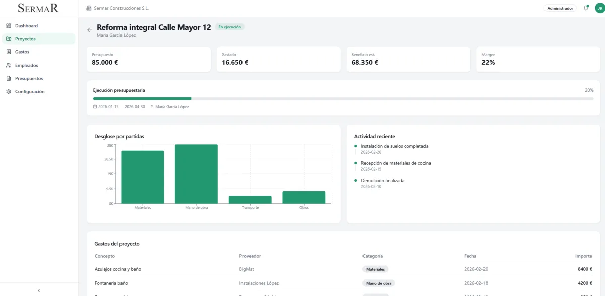 Registro detallado de materiales, mano de obra y proveedores, con vinculación directa a cada proyecto y alertas por sobrecoste.