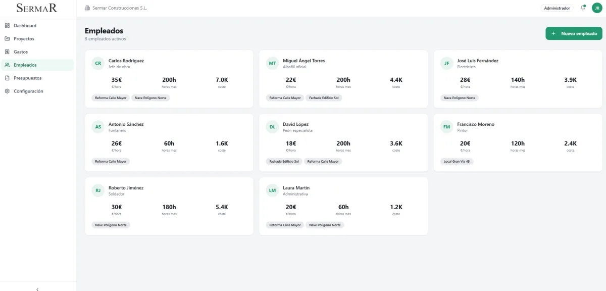 Asignación por proyecto, registro de horas trabajadas y cálculo automático del coste real de mano de obra.