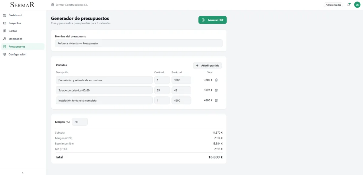 Cada obra cuenta con presupuesto desglosado por partidas, estados de ejecución, calendario y documentación asociada. El sistema calcula automáticamente el margen estimado y las desviaciones.